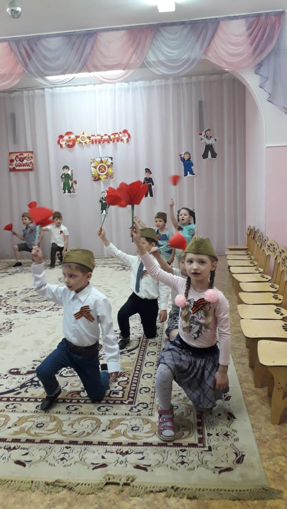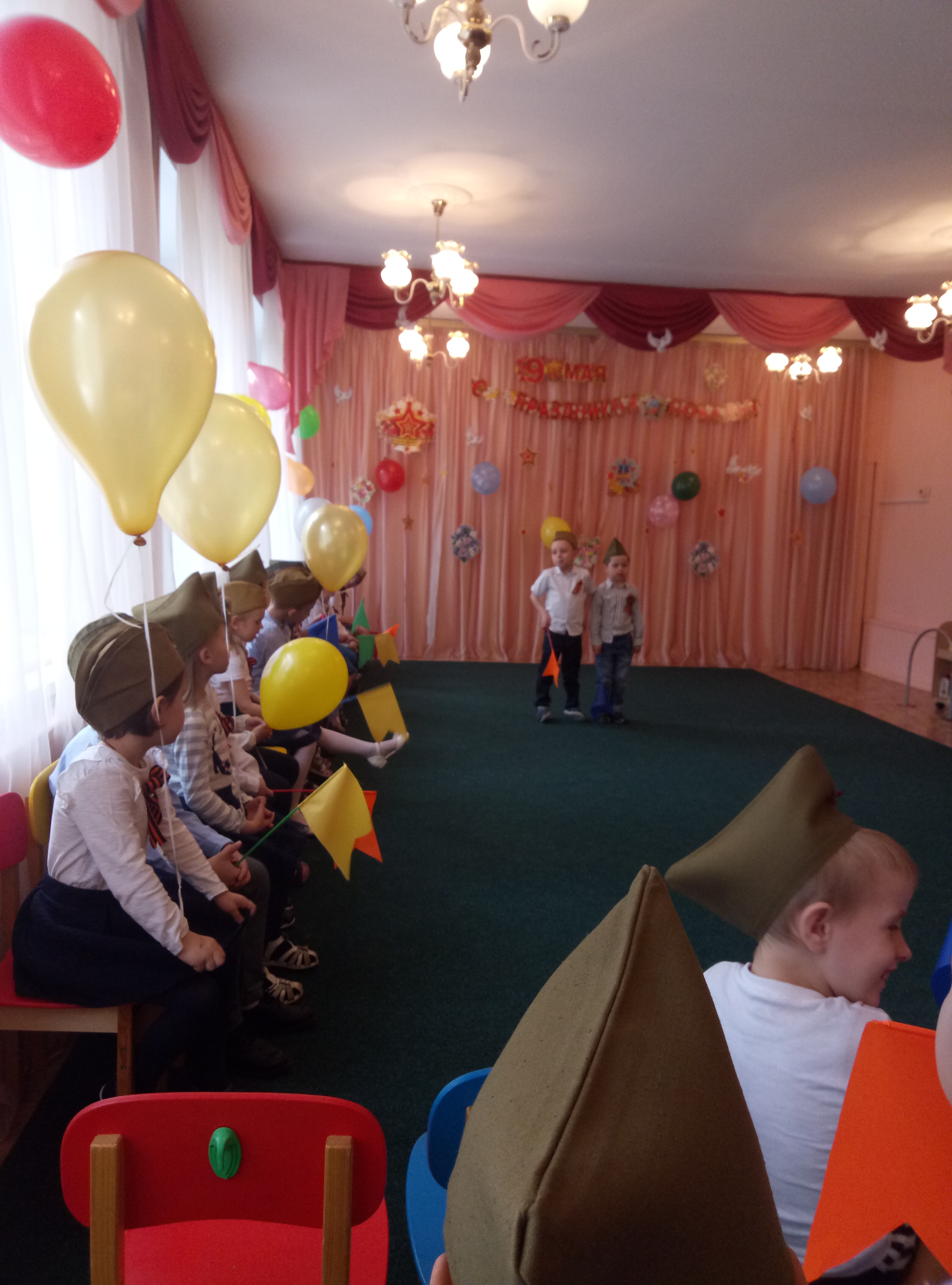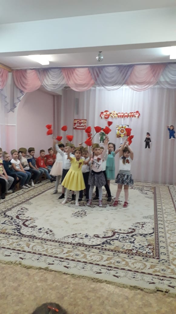 На протяжении десятилетий День Победы 9 мая остается в России самым трогательным, самым душевным праздником и славной датой. Никакие другие праздники не смогут сравниться с ним. В нашем детском саду тоже состоялось мероприятие, посвященное празднованию Дня Победы. Предварительно с детьми в группах были проведены занятия, беседы о подвигах советских людей,.В группах были оформлены выставки детских работ, оформлены родительские уголки, а праздник стал итогом этих мероприятий. Дети показали танец «Синий платочек», упражнение с флажками и цветами «День Победы», пели песни «В «День Победы», “Катюша”, «Победный марш», «Пусть всегда будет солнце».